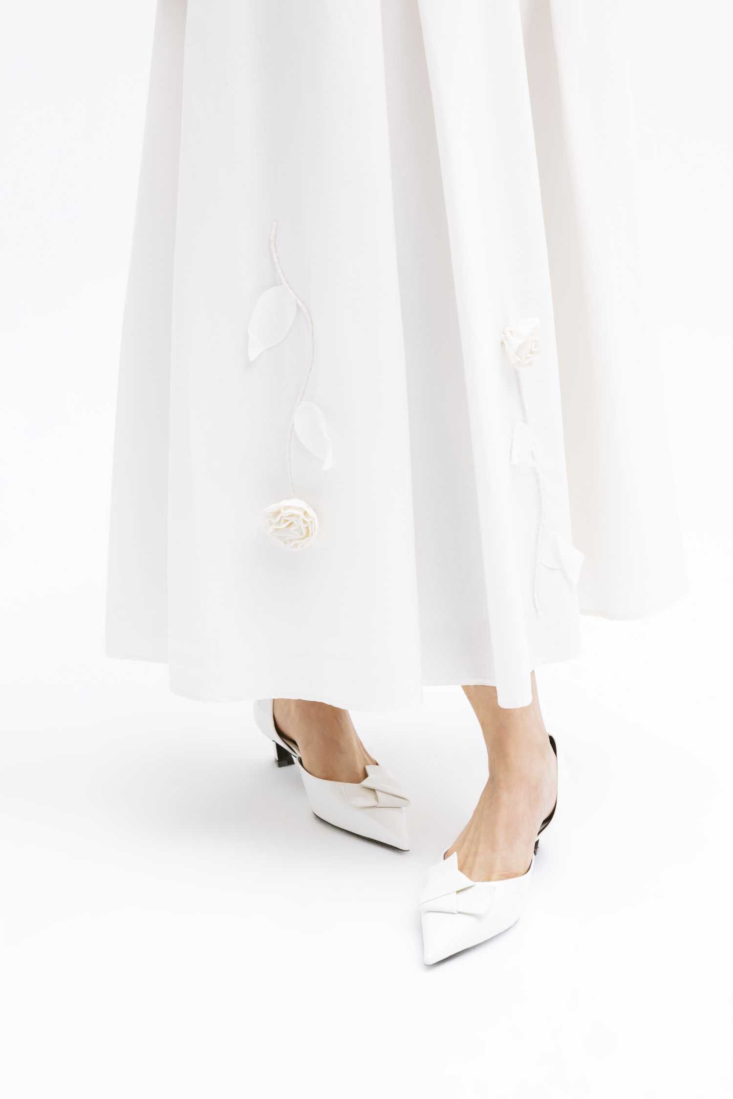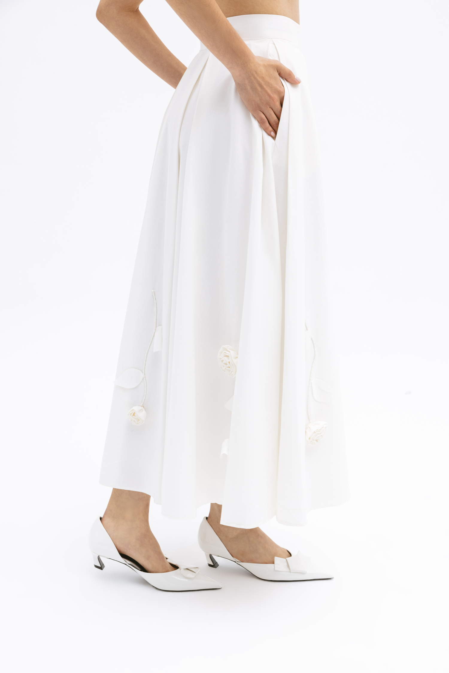 Crafted and lined with 100% cotton. Bloom features a bell-shaped skirt with refined open pleats that exude movement and dynamism. The skirt is adorned with six handcrafted embroidered flowers. Additionally, it offers pockets and an elegant maxi-length silhouette.